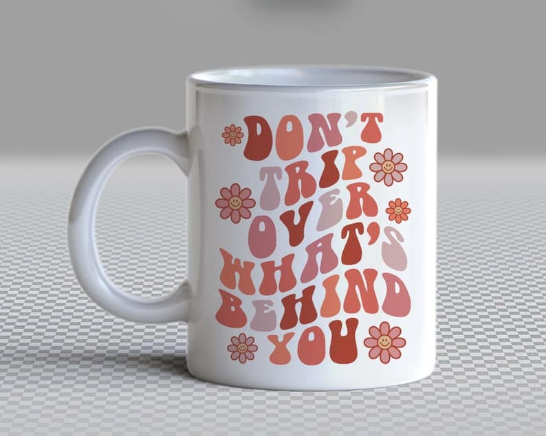 DON'T TRIP OVER WHAT'S BEHIND YOU COFFEE CUP