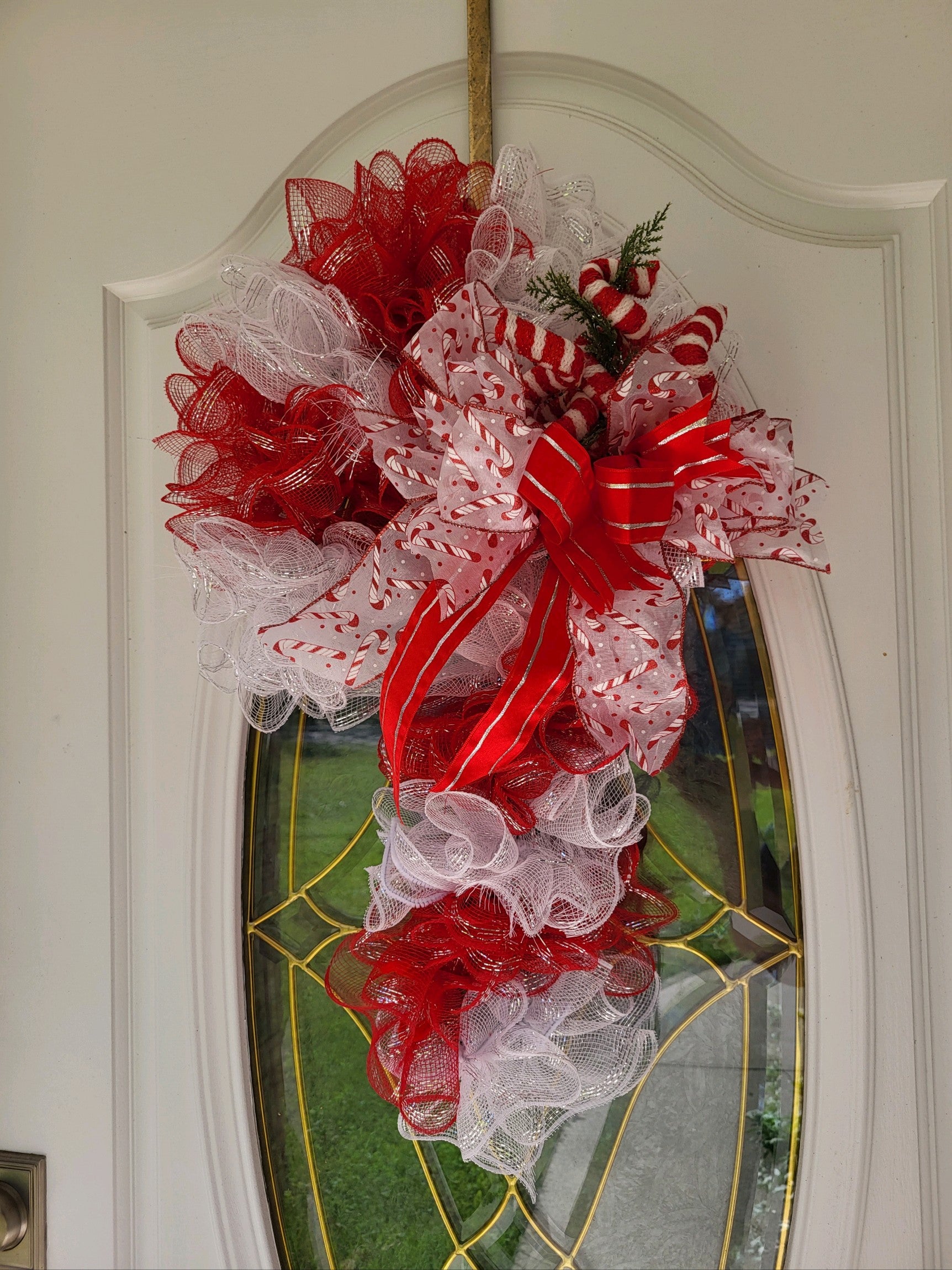 A beautiful red and white candy cane holiday wreath that will be a great addition to any door! ❤️💚❤️